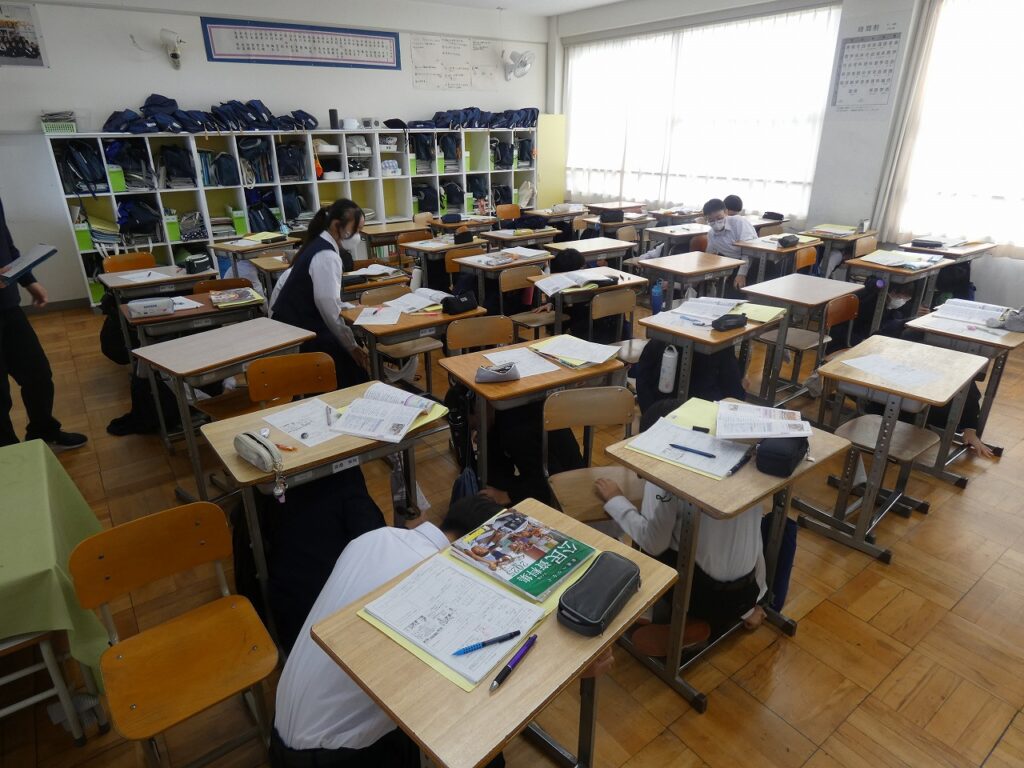 本日、市の防災無線による緊急地震速報に合わせてショート訓練を実施しました。