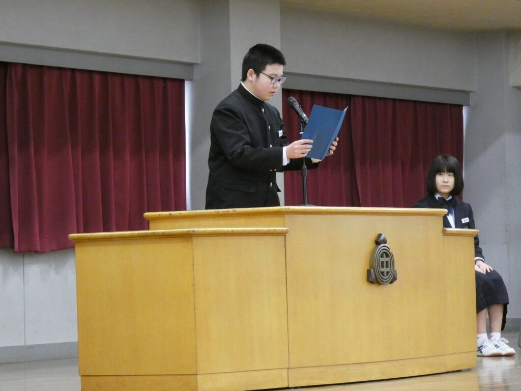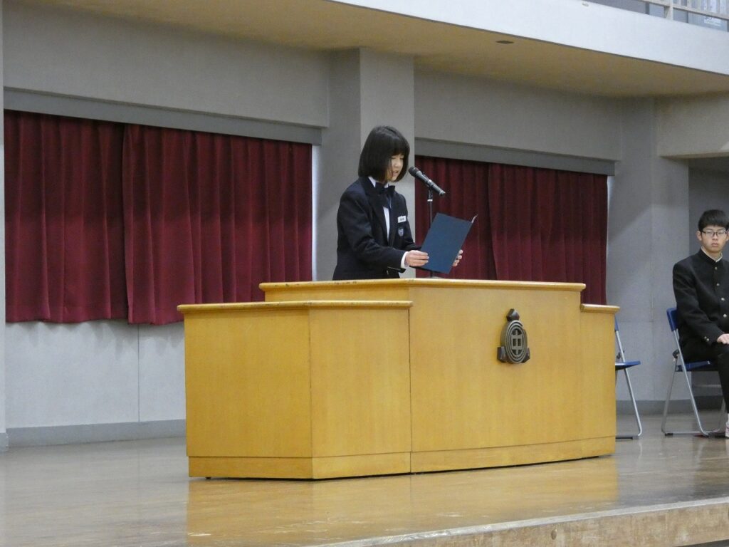 令和7年度の修了式を実施しました。また、今年度、最後の表彰も行い。活躍した生徒たちへ賞状等が手渡されました。式では、各学年の代表生徒から、1年間を振り返っての言葉があり、一人一人が、頑張り、成長したことが伝わってきました。1・2年生の皆さん、1年間、本当によく頑張りました。