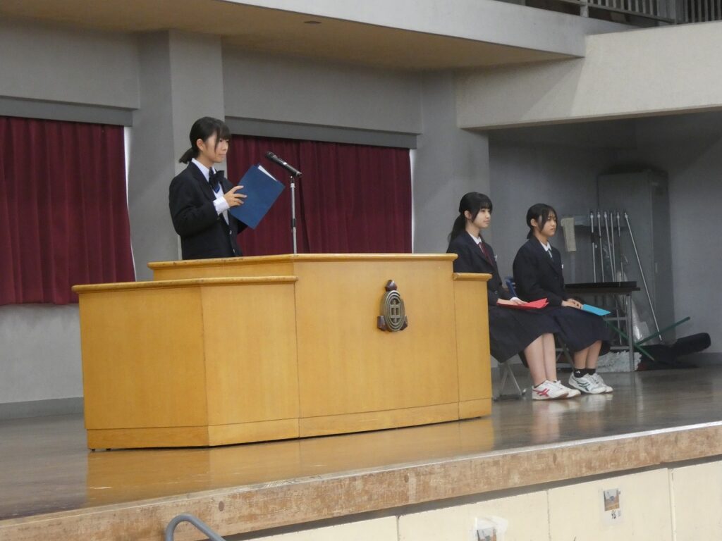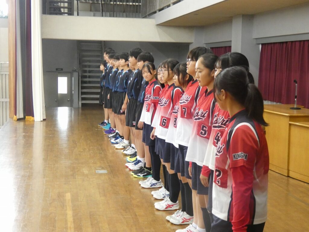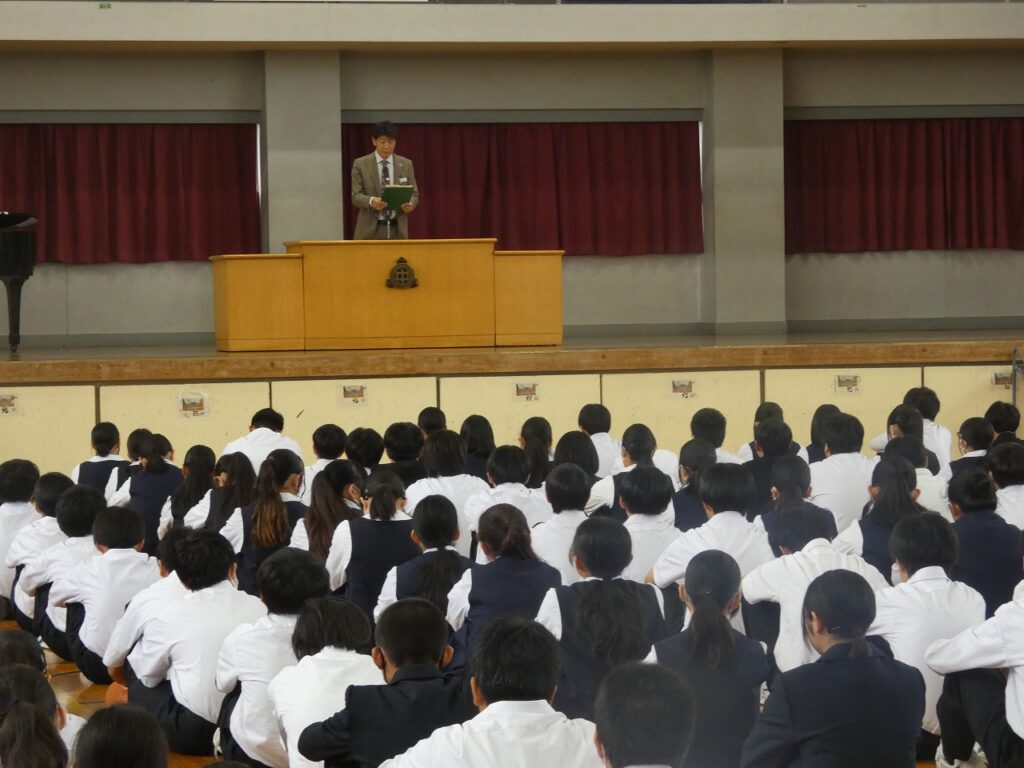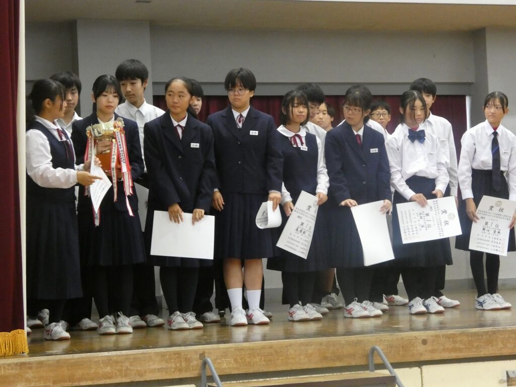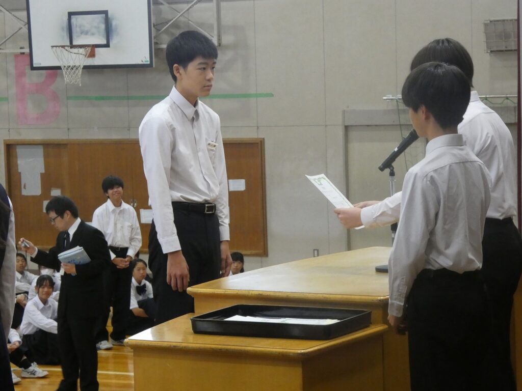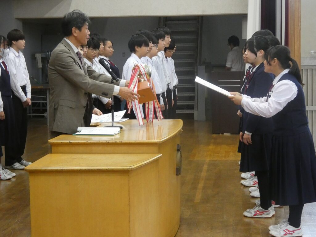 前期終業式・表彰・県大激励会 2025年10月16日 最終更新日時 : 2025年10月16日 kumagaya_edit 本日で、令和7年度前期が終了しました。生徒会主催の「四つ葉賞」の表彰、9月の新人戦の表彰や県大会に出場する選手への激励会を行いました。また、終業式では、各学年の代表から前期を振り返っての言葉が伝えられました。