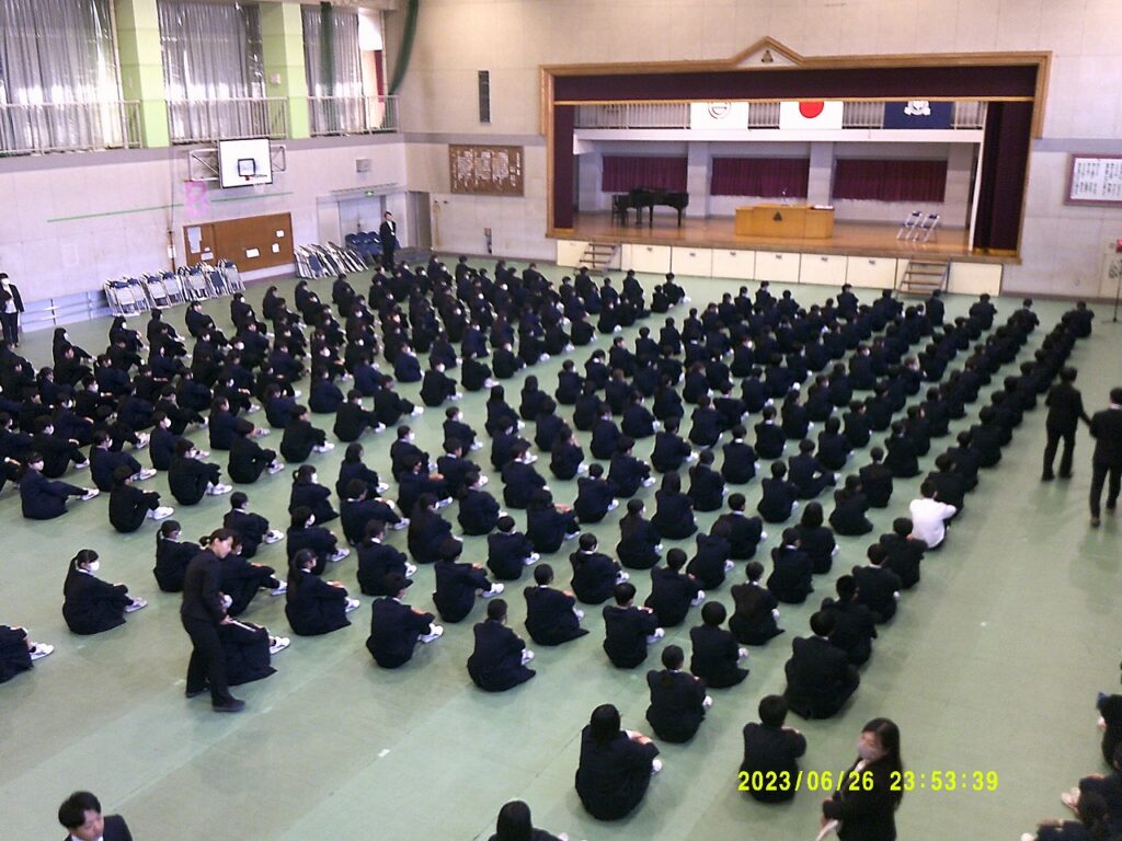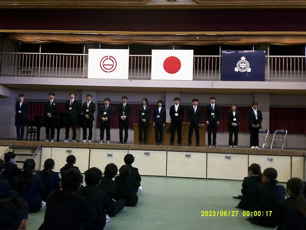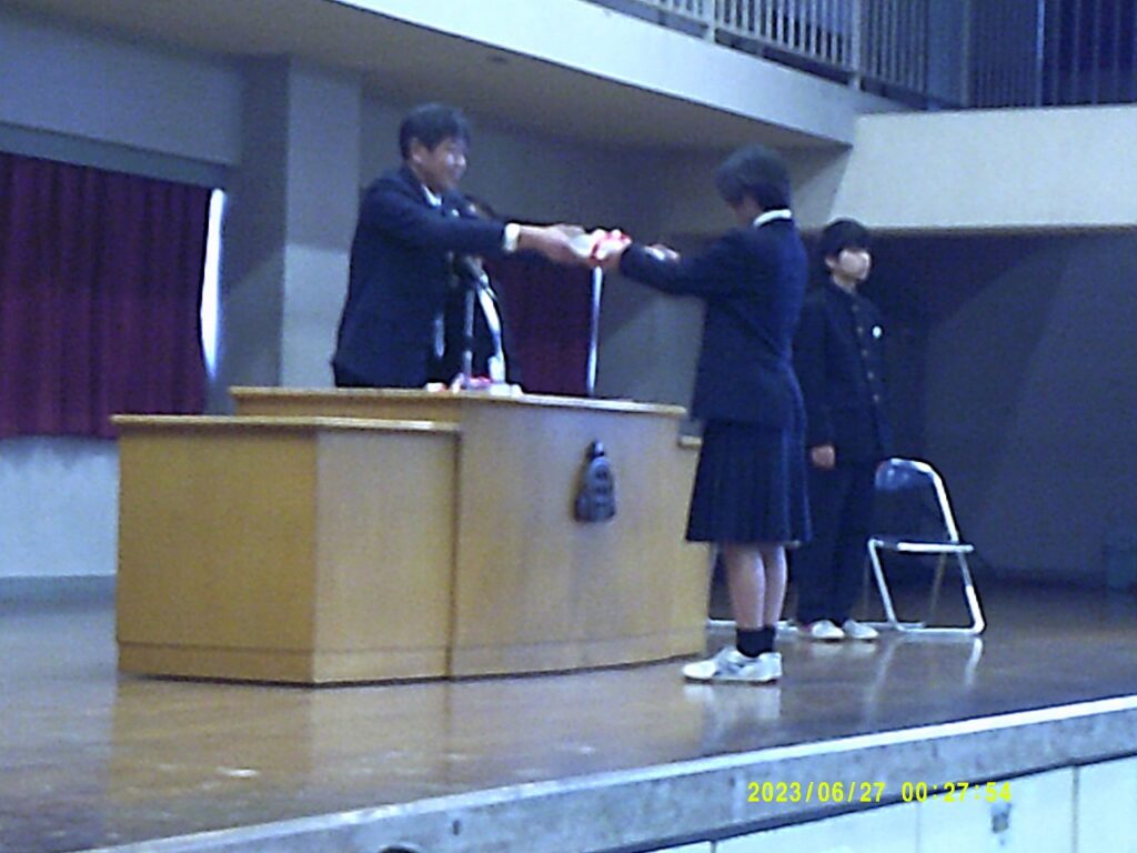 本日、2・3年生の前期始業式を行い、令和8年度がスタートしました。着任された先生方の紹介や、各学年の代表への教科書授与が行われました。また、各学年の代表から1年間の思いが伝えられました。