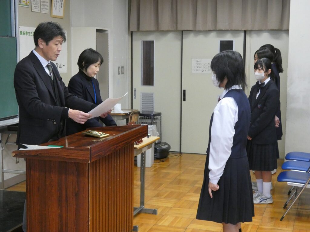 今日で、後期前半が終了します。冬休み前の全校集会で、図画の県知事賞などの多くの表彰が行われました。後期前半も生徒たちはよく頑張ってくれました。また、担当の先生方から冬休みの過ごし方についてお話がありました。規則正しい生活を意識し、充実した冬休みにしていきましょう。