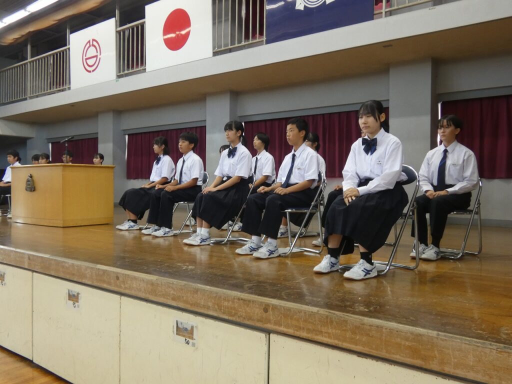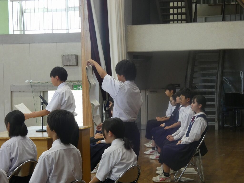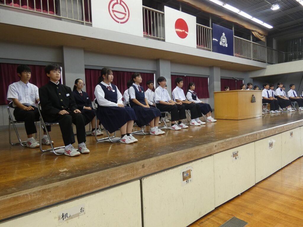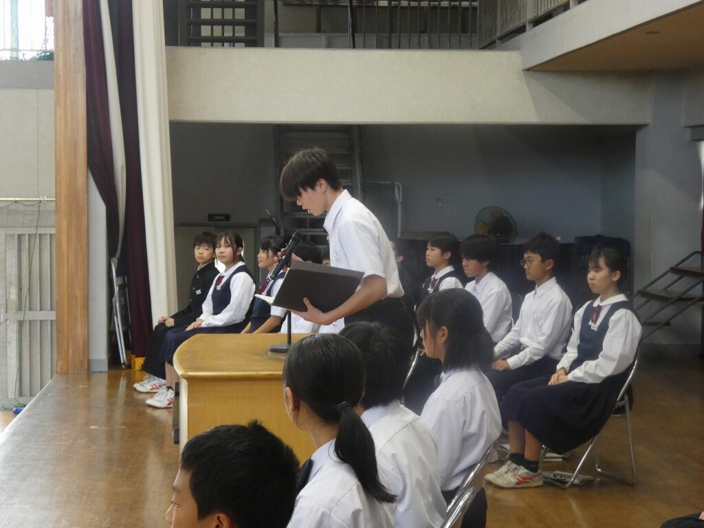 生徒会本部役員選挙 2025年10月2日 最終更新日時 : 2025年10月2日 kumagaya_edit 本日、第80期生徒会本部役員に立候補した11名の候補者の立会演説会及び投票が行われました。三尻中学校をよりよくするためにと勇気をもって立候補してくれた11名からは、具体的な方策を含めた決意が伝えられました。