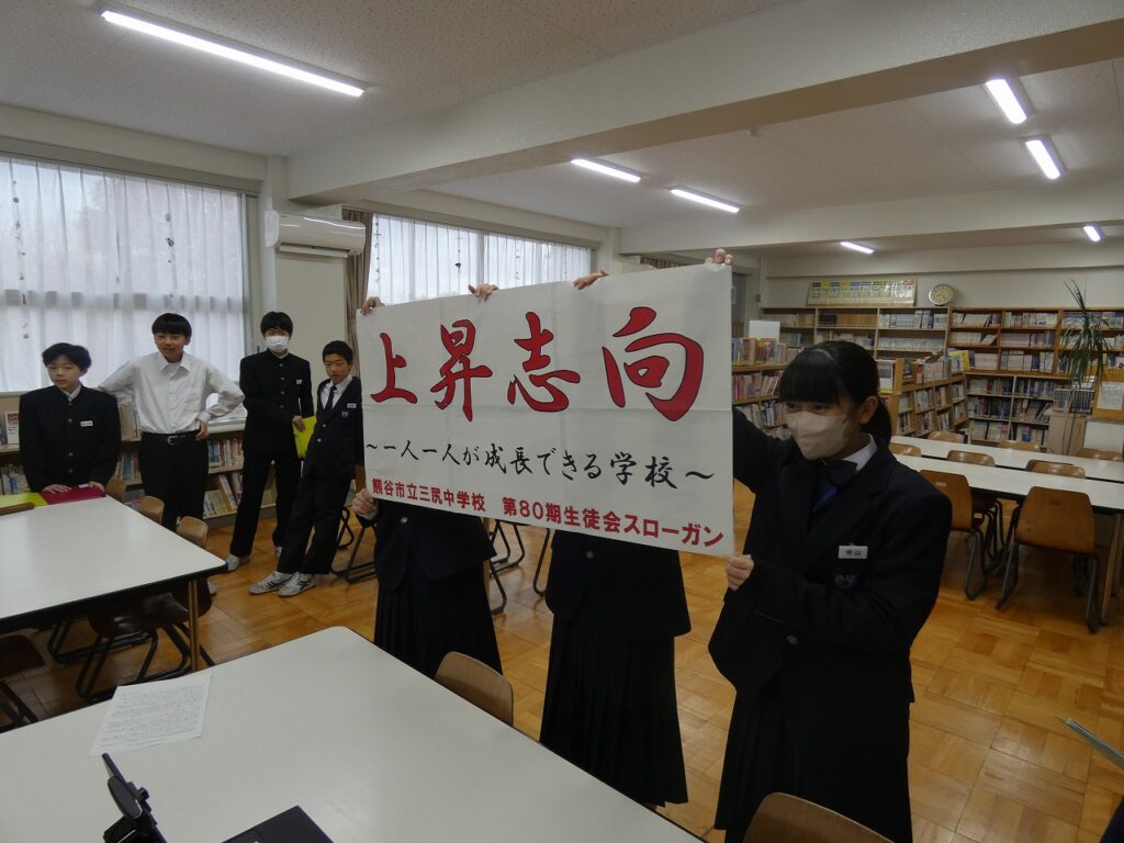 生徒朝会(生徒会本部) 2025年12月2日 最終更新日時 : 2025年12月2日 kumagaya_edit 本日、生徒会本部役員主体の生徒朝会を行いました。生徒会長から決意とともに取り組みについて説明がありました。また、80期となる生徒会のスローガンも発表されました。