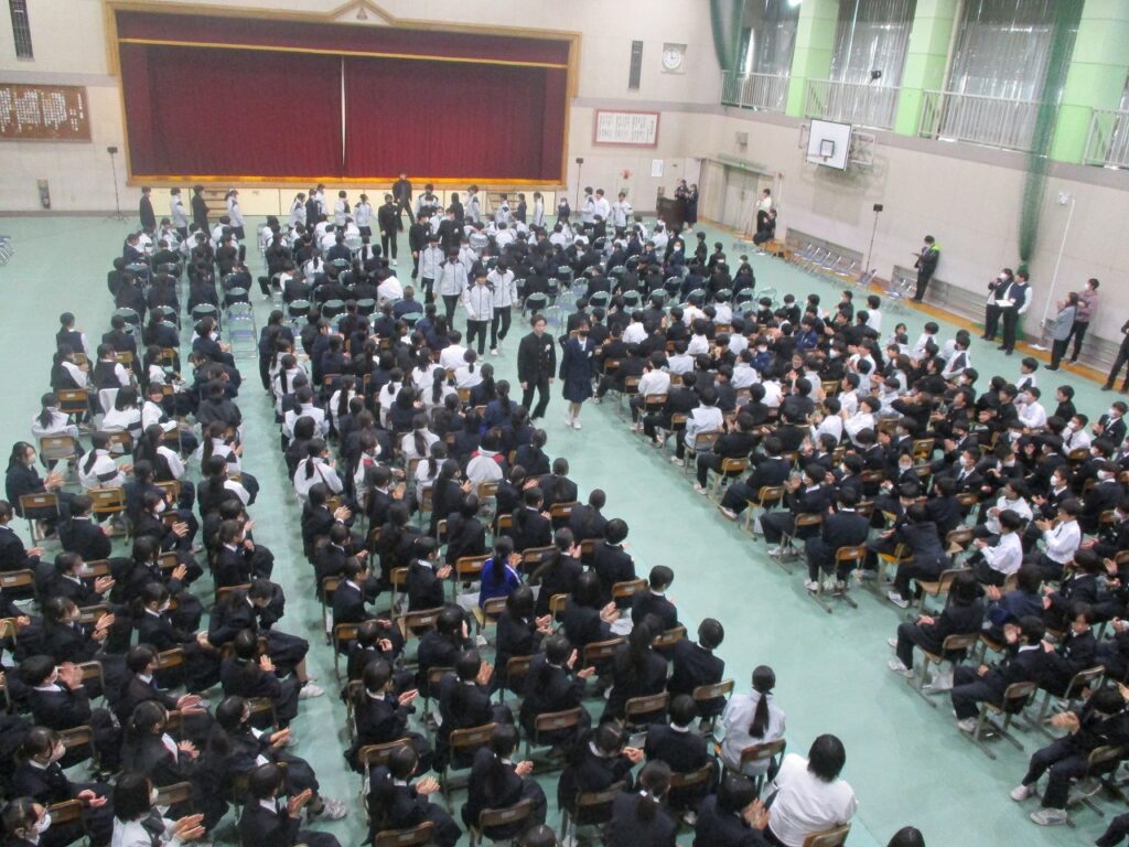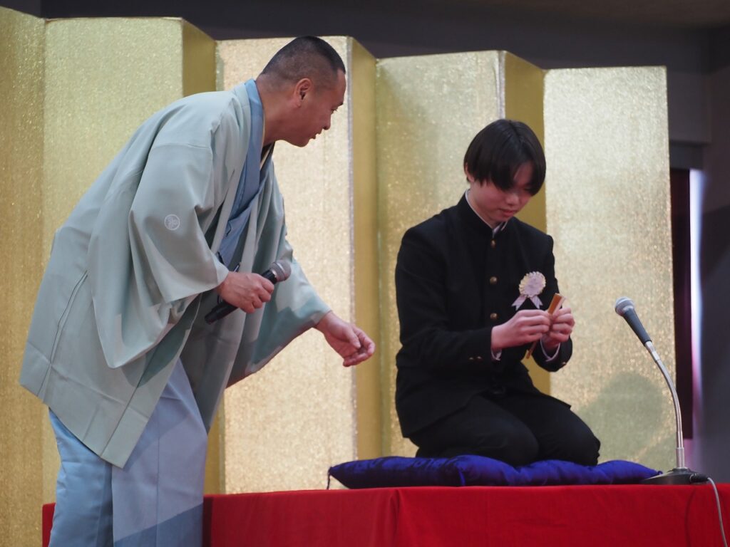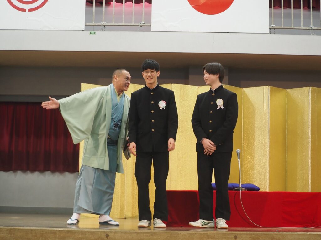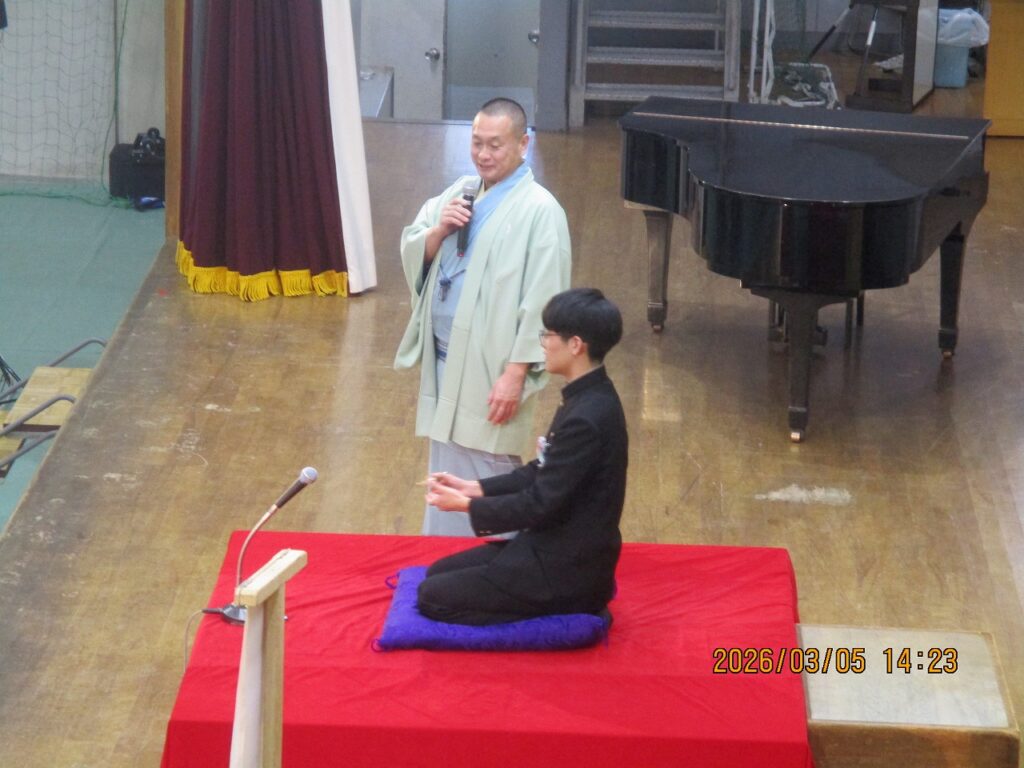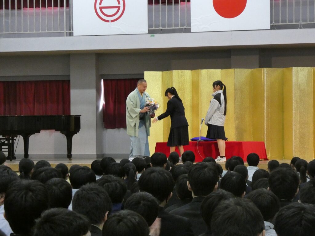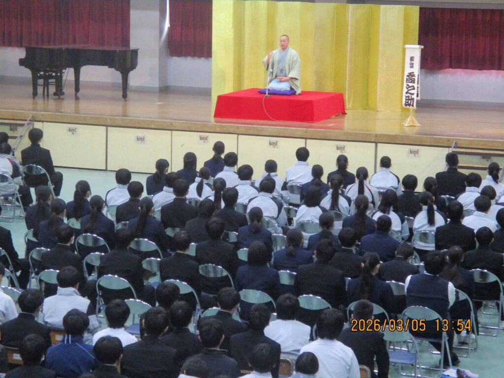 3年生の卒業前に芸術鑑賞会を開催しました。今年度は「落語」を鑑賞しました。代表の3年生の2名が落語の体験も行いました。準備をしてくれた1・2年生の皆さん、ありがとうございました。また、落語を披露していただいた落語家の皆さん、ありがとうございました。