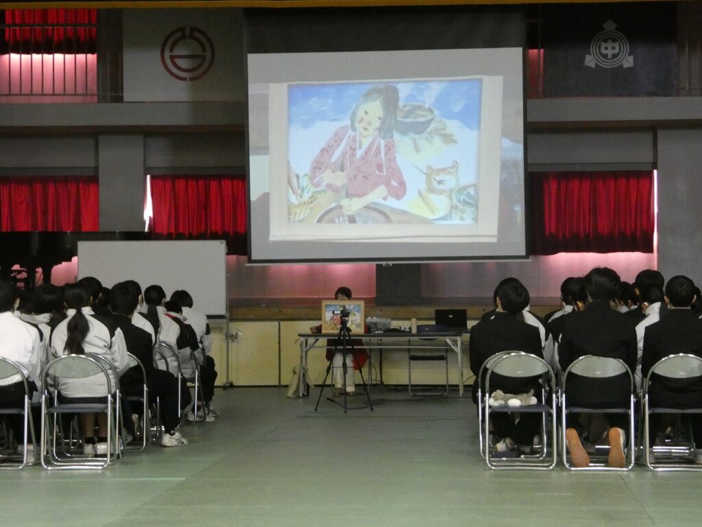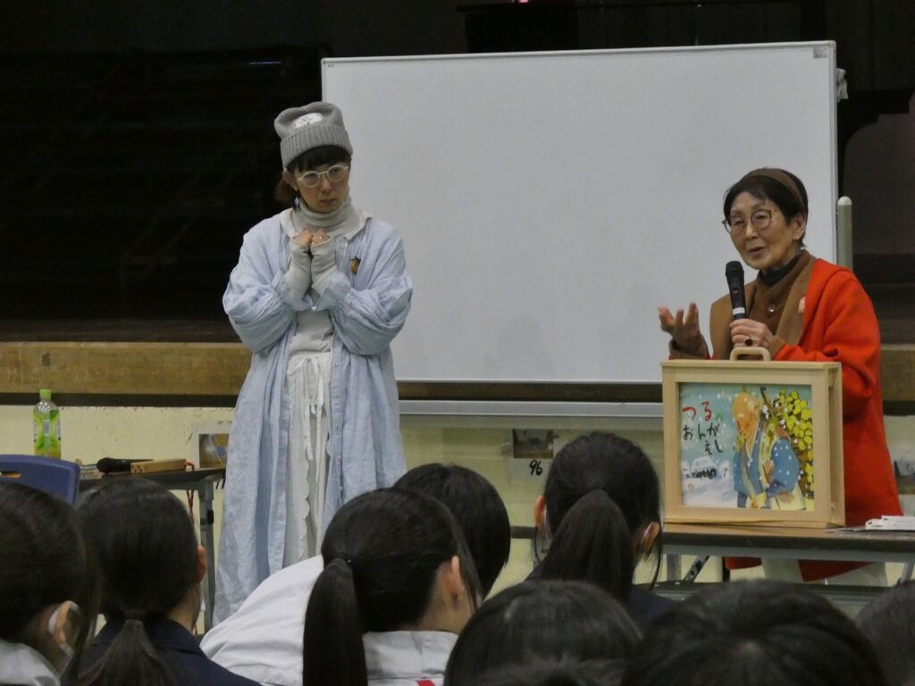 本日、森穎子さんとことなさんに来校していただき、英語による「つるのおんがえし」の紙芝居を鑑賞しました。また、ことなさんには、絵を活用したビンゴゲームをしていただき、心和む時間を体験させていただきました。森さん、ことなさん、大変ありがとうございました。